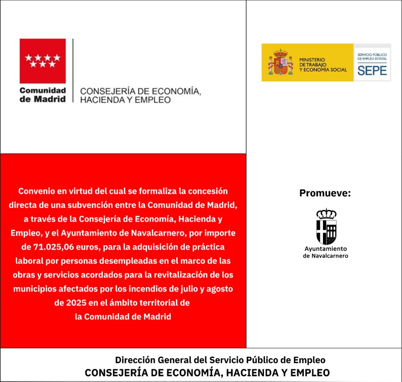 Convenio para la concesión directa de una subvención para la adquisición de práctica laboral por personas desempleadas en el marco de las obras y servicios acordados para la revitalización de los municipios afectados por los incendios de julio y agosto de 2025 en el ámbito territorial de la Comunidad de Madrid